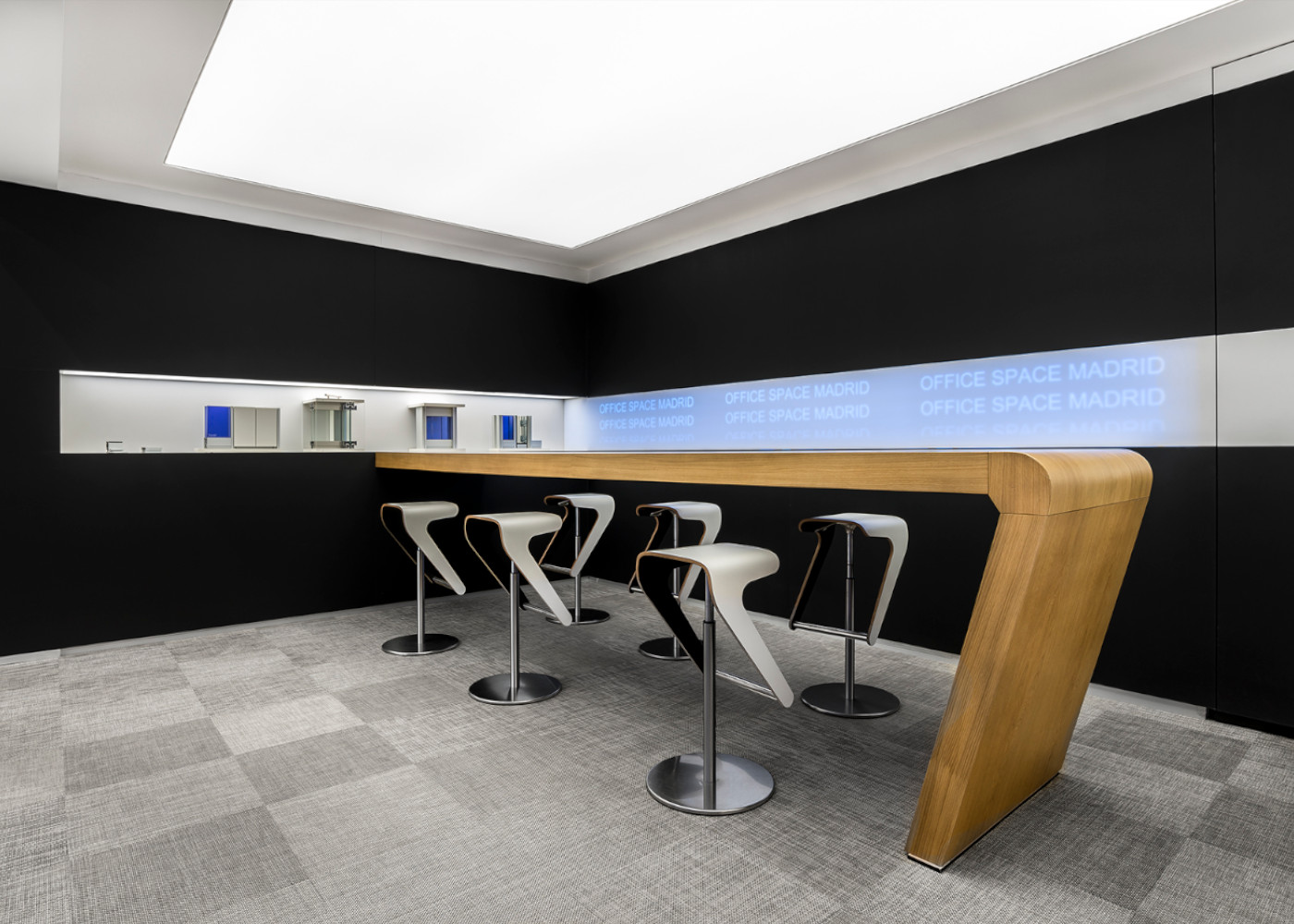 TILED PARTITION MATT BLACK LACQUERED GLASS AND BACKLIT CORIAN